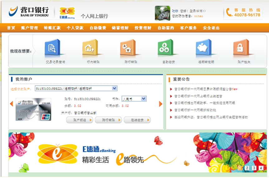 營口銀行個(gè)人網(wǎng)上銀行專業(yè)版提供賬戶管理、轉(zhuǎn)賬匯款、自助繳費(fèi)、儲(chǔ)蓄理財(cái)、投資理財(cái)、自助簽約、客戶服務(wù)等功能。您可以選擇相應(yīng)的菜單后點(diǎn)擊需要操作的子菜單進(jìn)行操作。 |
